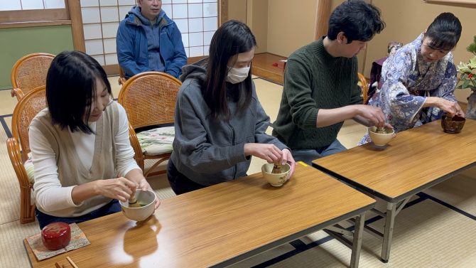 일본어 공부 중간에 학습자들이 차례로 일본식 다다미방에서 다도 체험을 했습니다.