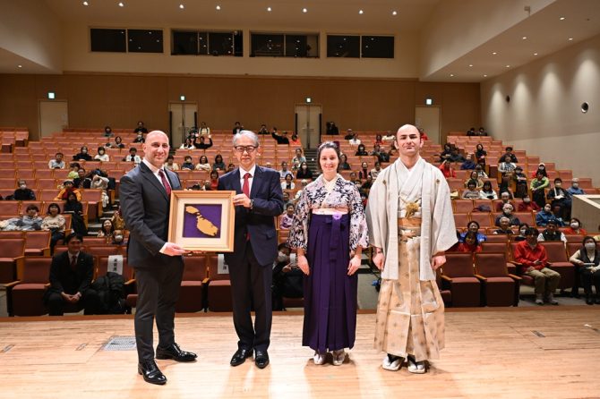 이어 주일 몰타공화국 대사관 안드레 스피테리 특명전권대사가 몰타 공화국에 대해 이야기해 주었습니다. 스피테리 대사에게는 나카노구 국제교류협회에서 나카노구 전통공예보존회 소속 에도 목조각자인 아마노 테루요시 씨에게 의뢰하여 제작한, 몰타 공화국의 국토 모양을 본뜬 목조 기념품을 선물했습니다.