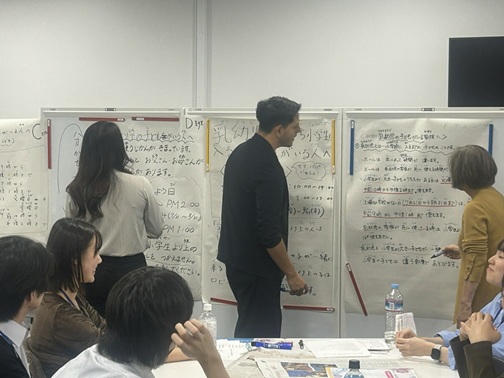 研修生は、直接窓口などで使われる「口頭編」と、ちらしやガイドブック案内作成など、文章による「翻訳編」によるグループワークとして、終日熱心に取り組みました。研修には、実際に通じる「やさしい日本語」を試すために、中野区在住の外国人アシスタント2名の方も、研修をサポートしました。